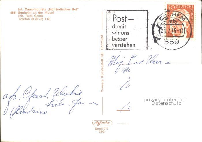 72253819 alte Postkarte Senheim-Senhals Kirchenpartie mit Mosel Campingplatz postalisch gelaufen Erhaltung siehe scans KatCode: 11110007135079