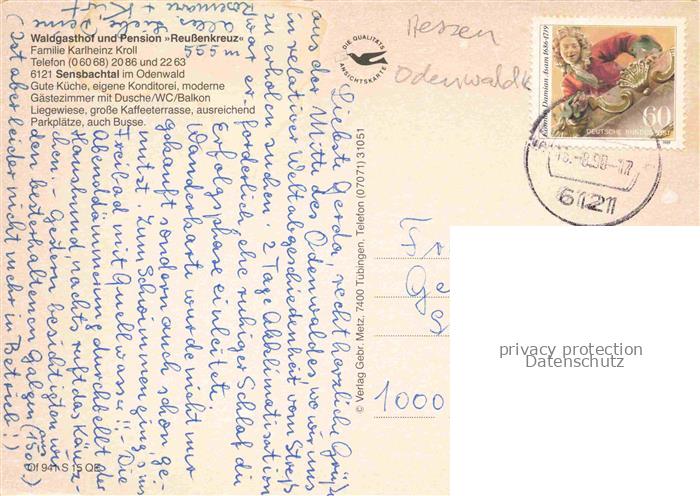 74042631 alte Postkarte Sensbachtal Waldgasthof Pension Reussenkreuz Wegweiser postalisch gelaufen Fliegeraufnahme Erhaltung siehe scans [FriedD77] KatCode: 11110006437015