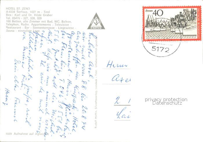 72468239 alte Postkarte Serfaus Tirol Hotel St Zeno Kapelle postalisch gelaufen Erhaltung siehe scans KatCode: 11390334070624