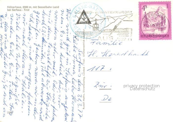 73756903 alte Postkarte Serfaus Tirol Koelnerhaus Aussenansicht Skilaeufer postalisch gelaufen Erhaltung siehe scans [LiesaD40] KatCode: 11390334070624