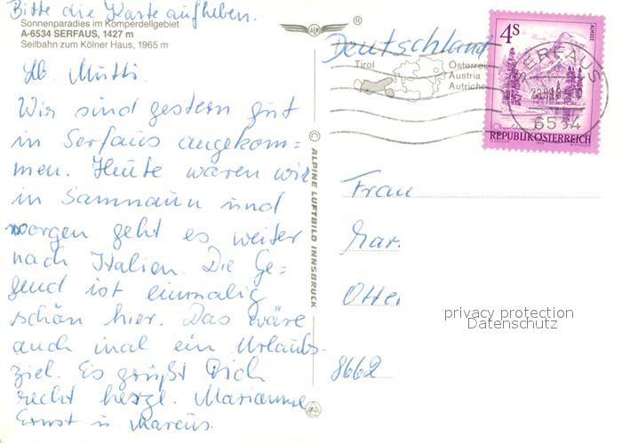 73516419 alte Postkarte Serfaus Tirol Sonnenparadies Komperdellgebiet Alpenpanorama Fliegeraufnahme postalisch gelaufen Erhaltung siehe scans [FriedD77] KatCode: 11390334070624