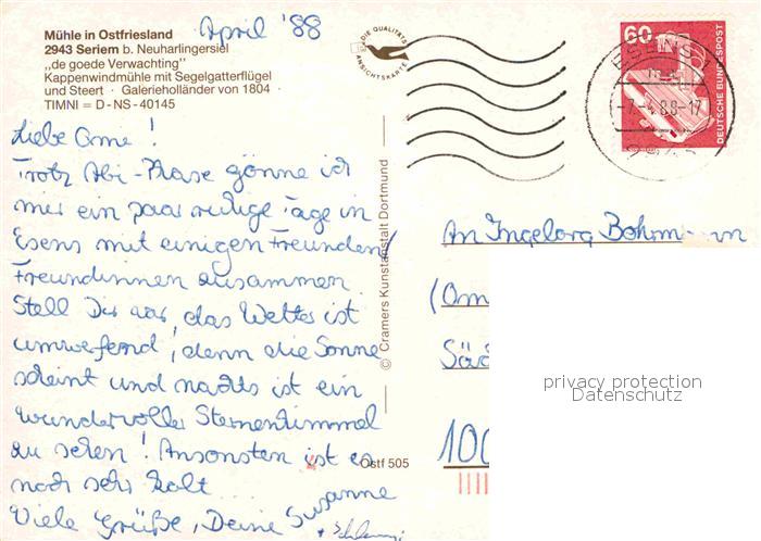 72846175 alte Postkarte Seriem Muehle in Ostfriesland Kappenwindmuehle mit Segelgatterfluegel und Steert postalisch gelaufen Erhaltung siehe scans [FriedD77] KatCode: 11110003462010