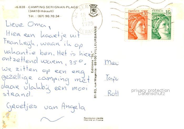 13048277 carte postale Serignan Plage Camping Dorfmotive postalisch gelaufen Erhaltung siehe scans [WerneD78] KatCode: 11170034134299