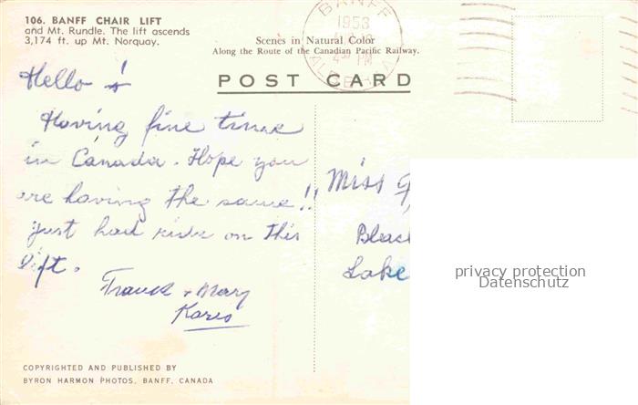 74137058 alte Postkarte Sessellift Chairlift Telesiege Banff Chair postalisch gelaufen Erhaltung siehe scans [SanaeD93] KatCode: 22040000000400