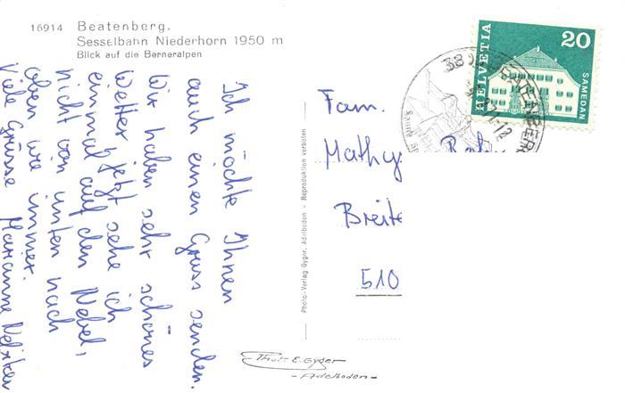 74005494 alte Postkarte Sessellift Chairlift Telesiege Beatenberg Sesselbahn Niederhorn 1950m postalisch gelaufen Erhaltung siehe scans [SanaeD93] KatCode: 22040000000400