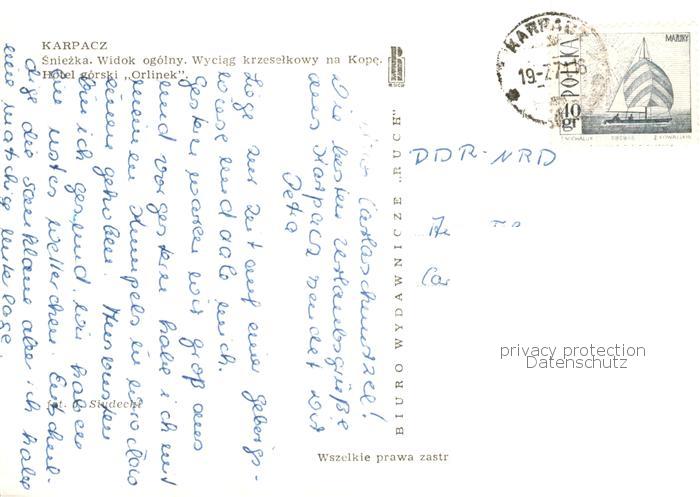 73898990 alte Postkarte Sessellift Chairlift Telesiege Karpacz Sniezka postalisch gelaufen Erhaltung siehe scans [IrynaD87] KatCode: 22040000000400