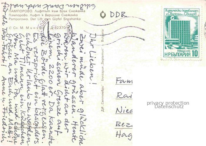 74096536 alte Postkarte Sessellift Chairlift Telesiege Pamporowo Bulgarien Sneshanka postalisch gelaufen Erhaltung siehe scans [SanaeD93] KatCode: 22040000000400