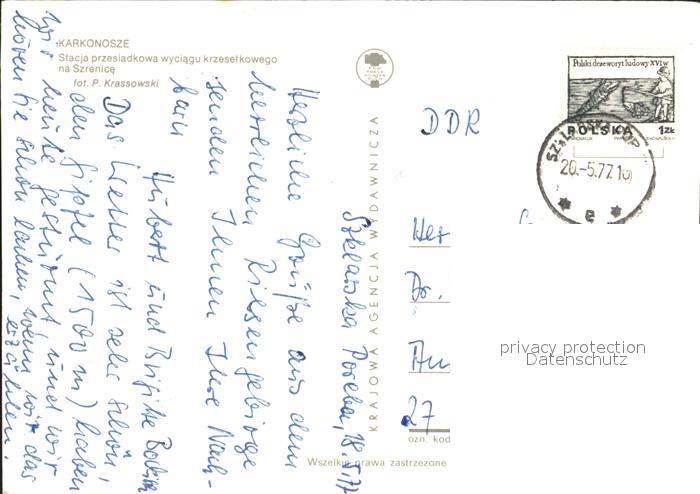 alte Postkarte Sessellift Karkonosze Stacja przesiadkowa wyciagu krzeselkowego na Szrenice postalisch gelaufen Erhaltung siehe scans