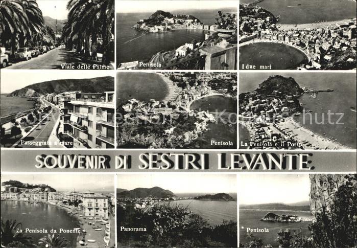 old postcard Sestri Levante Viale delle Palme Penisola I due mari Passeggiata Porto Penisola da Ponente Panorama postalisch gelaufen Erhaltung siehe scans