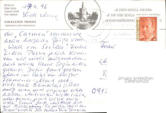 old postcard Sevilla Andalucia Calle tipica postalisch gelaufen Erhaltung siehe scans
