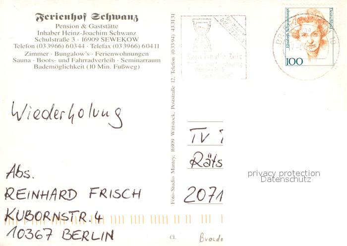73659752 alte Postkarte Sewekow Ferienhof Schwanz Pension Gaststaette postalisch gelaufen Erhaltung siehe scans [FriedD77] KatCode: 11110012068468