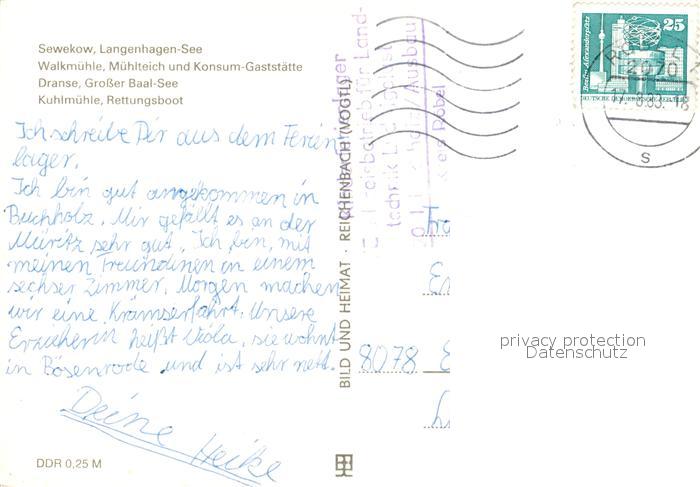 73257377 alte Postkarte Sewekow Ferienzentrum Langenhagensee Walkmuehle Muehlteich Konsumgaststaette Dranse Grosser Baalsee Kuehlmuehle Rettungsboot postalisch gelaufen Erhaltung siehe scans [FriedD77] KatCode: 11110012068468