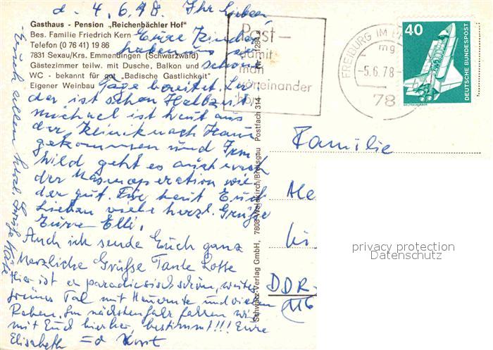 72742257 alte Postkarte Sexau Gasthaus Pension Reichenbaechler Hof postalisch gelaufen Erhaltung siehe scans [FriedD77] KatCode: 11110008316039