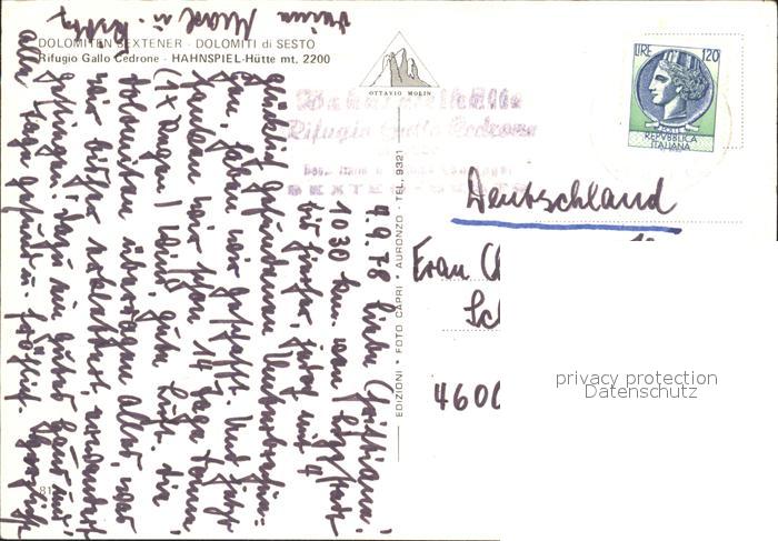 old postcard Sexten Sesto Suedtirol Hahnspiel Huette Dreischuster Schwalbenkofel Haunold postalisch gelaufen Erhaltung siehe scans