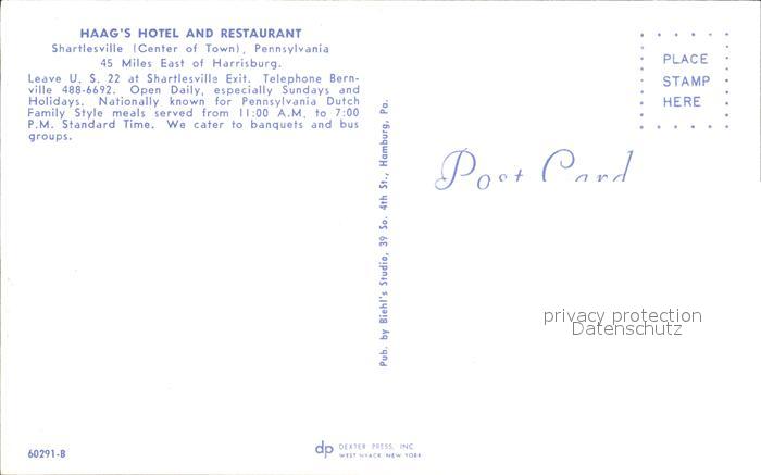 72161939 Shartlesville Haag’s Hotel and Restaurant postalisch nicht gelaufen Erhaltung siehe scans KatCode: 14140410000000