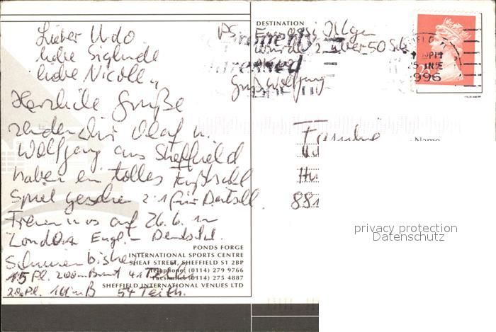 old postcard Sheffield Ponds Forge International Sports Centre postalisch gelaufen Erhaltung siehe scans
