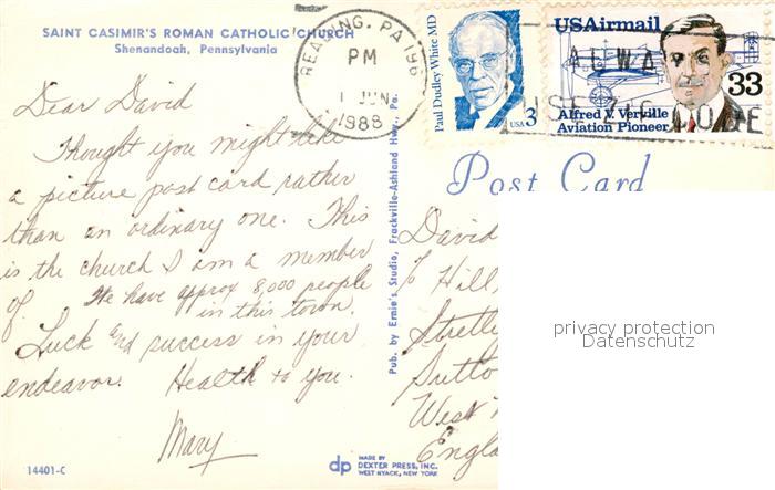 73131583 old postcard Shenandoah Pennsylvania Saint Casimir Roman Catholic Church postalisch gelaufen Erhaltung siehe scans [KathaD81] KatCode: 14140410000000