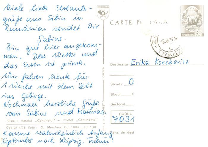 old postcard Sibiu Hermannstadt RO Hotelul Continental postalisch gelaufen Erhaltung siehe scans [FriedD77]