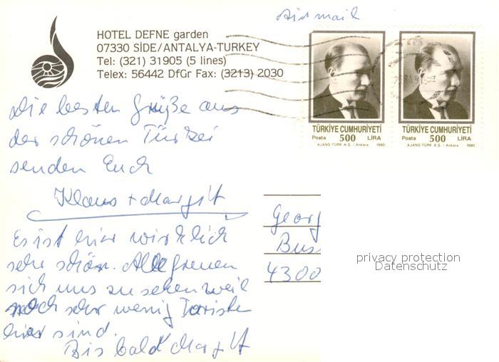 old postcard Side Antalya Hotel Defne garden postalisch gelaufen Erhaltung siehe scans [WerneD78]