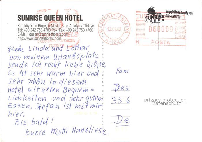 old postcard Side Antalya Sunrise Queen Hotel Gastraum Pool postalisch gelaufen Erhaltung siehe scans