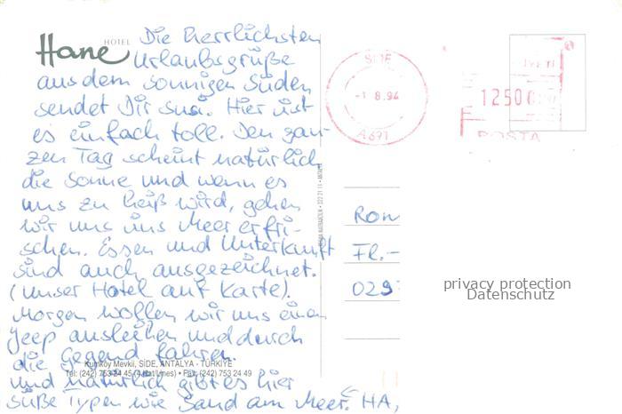 74005666 old postcard Side Antalya TK Hotel Hane Park postalisch gelaufen Erhaltung siehe scans [WerneD78] KatCode: 11530