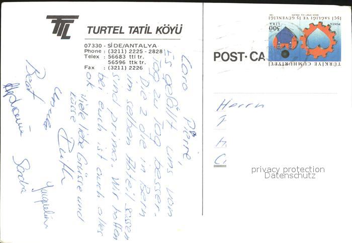 old postcard Side Antalya Turtel Tatil Koeyue Swimming Pool postalisch gelaufen Erhaltung siehe scans