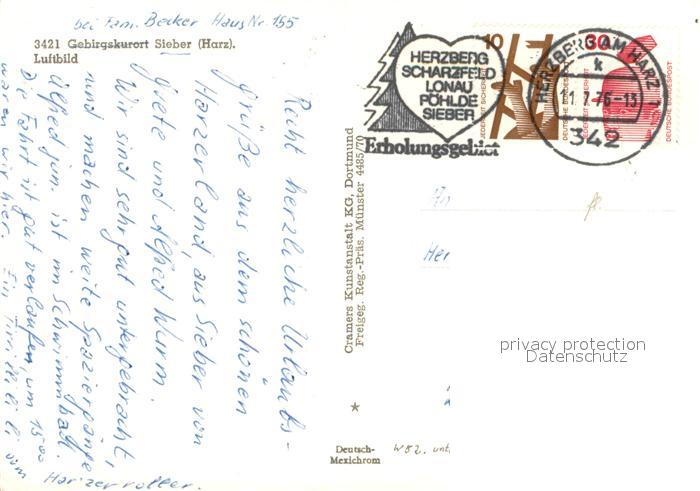 73740103 Sieber Herzberg am Harz Osterode Niedersachsen Fliegeraufnahme postalisch gelaufen Erhaltung siehe scans [FriedD77] alte Postkarte Frie Katcode 11110003156009