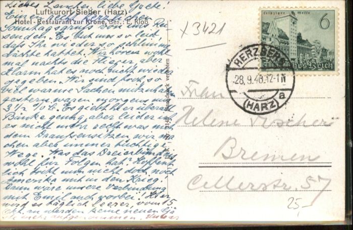 40878318 Sieber Herzberg am Harz Osterode Niedersachsen Hotel Restaurant zur Krone postalisch gelaufen Alte Ansichtskarte Postkarte alte Postkarte Katcode 11110003156009