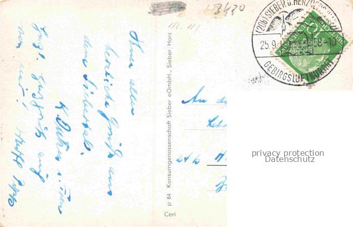 74150962 alte Postkarte Sieber Herzberg am Harz Osterode Niedersachsen Panorama Kirche Goldenke Promenade Dorfstrasse Mitteldorf Waldpartie postalisch gelaufen Erhaltung siehe scans [FriedD77] KatCode: 11110003156009