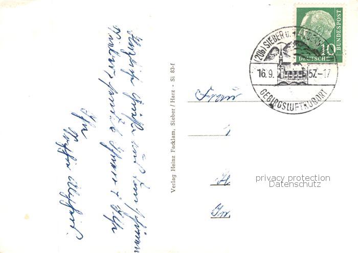 73812934 alte Postkarte Sieber Herzberg am Harz Promenadenweg Panorama Hanskuehnenburg Hauptstrasse Kirche postalisch gelaufen Erhaltung siehe scans [FriedD77] KatCode: 11110003156009