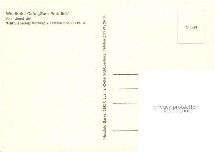 73845696 Siebertal Herzberg Waldhotel Cafe Zum Paradies postalisch nicht gelaufen Erhaltung siehe scans [FriedD77] KatCode: 11110003156009