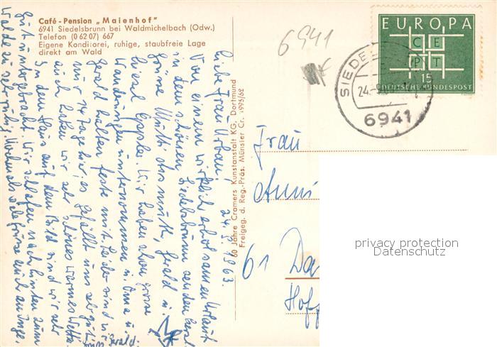 73727758 alte Postkarte Siedelsbrunn Cafe-Pension Maienhof postalisch gelaufen Erhaltung siehe scans [LiesaD40] KatCode: 11110006431021