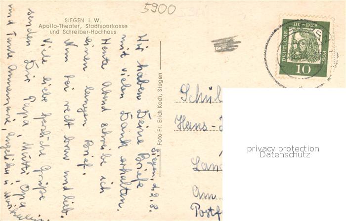73709954 alte Postkarte Siegen Westfalen Apollo-Theater u. Schreiber-Hochhaus postalisch gelaufen Erhaltung siehe scans [LiesaD40] KatCode: 11110005970040