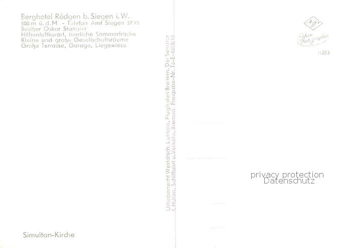 73854095 Siegen Westfalen Berghotel Roedgen Simultan Kirche postalisch nicht gelaufen Erhaltung siehe scans [WerneD78] KatCode: 11110005970040