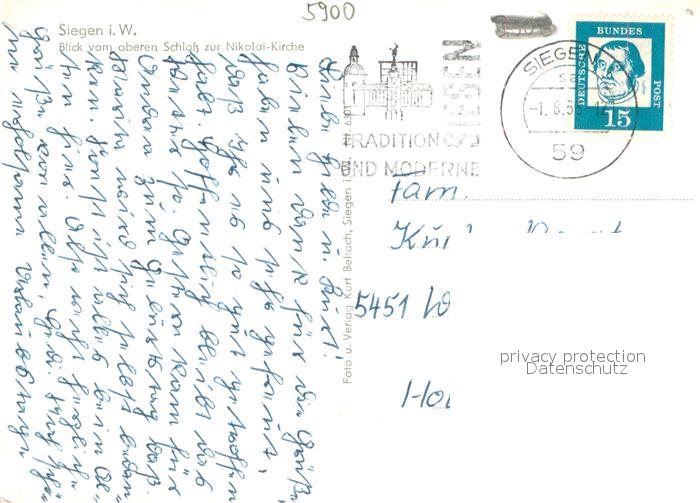 73700955 alte Postkarte Siegen Westfalen Blick vom oberen Schloss zur Nikolai Kirche postalisch gelaufen Erhaltung siehe scans [FriedD77] KatCode: 11110005970040