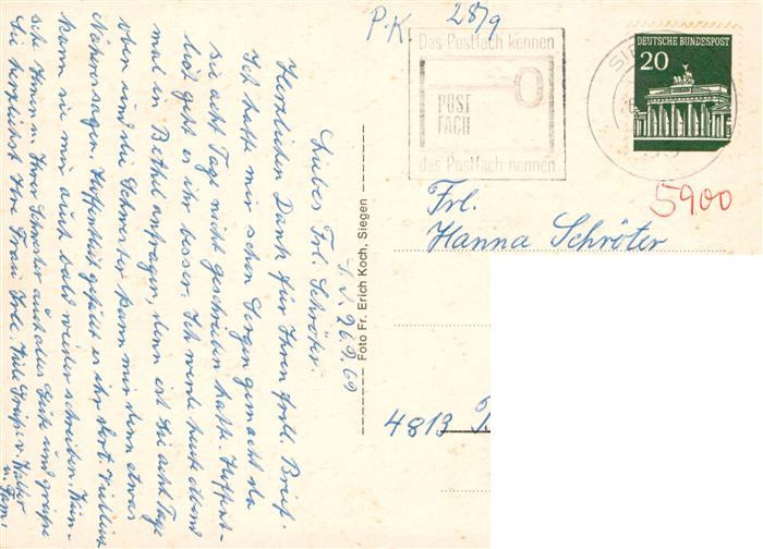 73924576 alte Postkarte Siegen Westfalen Leimbach Stadion mit neuem Jung Stilling Krankenhaus Hauptbahnhof und Vorplatz Martinikirche Unteres Schloss und Siegbruecke postalisch gelaufen Erhaltung siehe scans [WerneD78] KatCode: 11110005970040