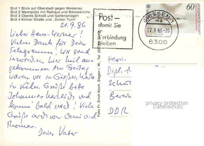 72917659 alte Postkarte Siegen Westfalen Oberstadt gegen Weidenau Marktplatz Rathaus Kirche Schloss Gartenanlagen Koelner Strasse Dicker Turm postalisch gelaufen Erhaltung siehe scans [FriedD77] KatCode: 11110005970040