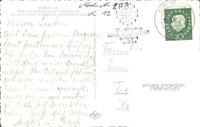 72228060 alte Postkarte Siegen Westfalen Panorama Blick vom Giersberg auf Siegberg Schloss Nikolaiturm Michaelkirche Baumbluete postalisch gelaufen Erhaltung siehe scans KatCode: 11110005970040