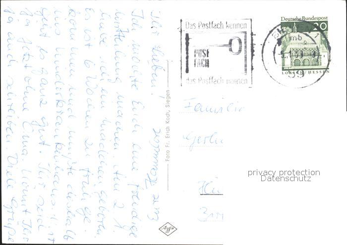 72064033 alte Postkarte Siegen Westfalen Siegberg Marktplatz Siegbruecke Unteres Schloss Huettenmann Kroenchen Bergmann Leimbach Stadion Bahnhofsvorplatz Hochhaus Fernmeldeamt postalisch gelaufen Erhaltung siehe scans KatCode: 11110005970040
