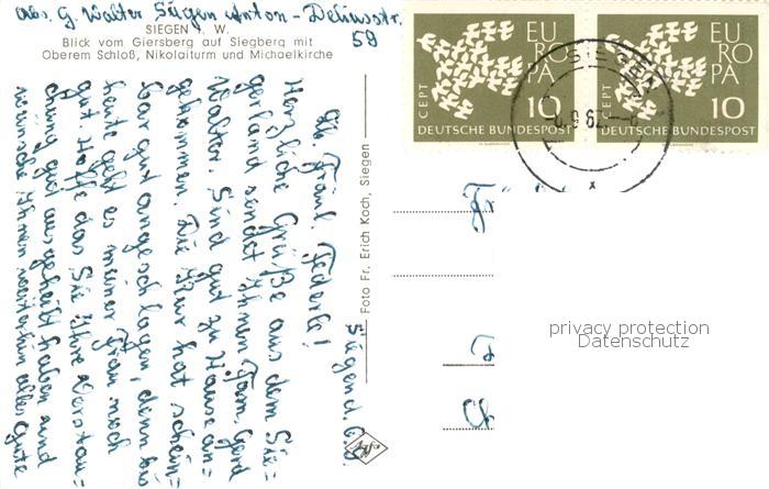 73835042 alte Postkarte Siegen Westfalen Siegberg Oberes Schloss Nikolaiturm und Michaelkirche postalisch gelaufen Erhaltung siehe scans [WerneD78] KatCode: 11110005970040