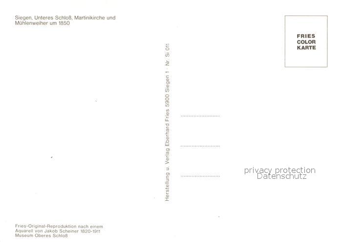 72949545 Siegen Westfalen Unteres Schloss Martinikirche Muehlenweiher Aquarell von Jakob Scheiner postalisch nicht gelaufen Reprokarte (modern) Erhaltung siehe scans [NatalD47] KatCode: 11110005970040