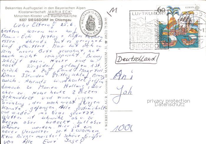 71892895 alte Postkarte Siegsdorf Oberbayern Kloster Maria Eck Wallfahrtskirche Bayerische Alpen Fliegeraufnahme postalisch gelaufen Erhaltung siehe scans KatCode: 11110009189145