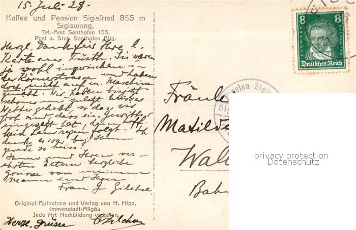 73561885 alte Postkarte Sigiswang Kaffee Pension Sigisfried postalisch gelaufen Erhaltung siehe scans [KathaD81] KatCode: 11110009780134