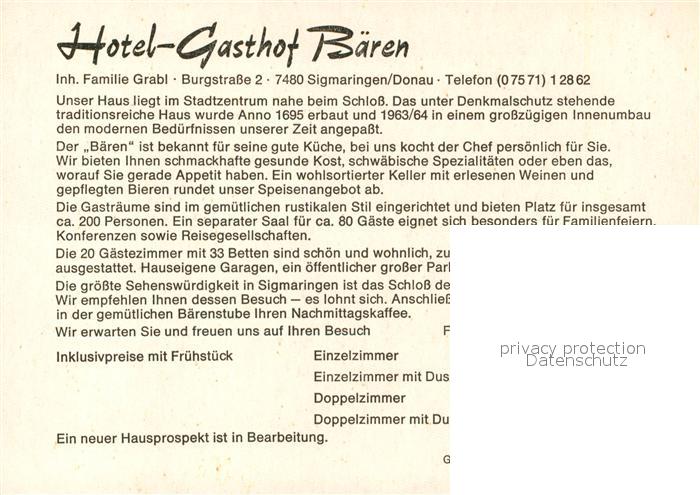 73543010 Sigmaringen Hotel Gasthof Baeren Fachwerkhaus postalisch nicht gelaufen Werbekarte (keine Postkarte) Erhaltung siehe scans [FriedD77] KatCode: 11110008437104