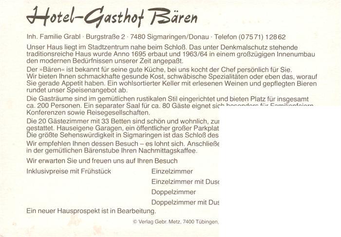 73883702 Sigmaringen Hotel Gasthof Baeren Schloss Gastraeume postalisch nicht gelaufen Werbekarte (keine Postkarte) Erhaltung siehe scans [FriedD77] KatCode: 11110008437104