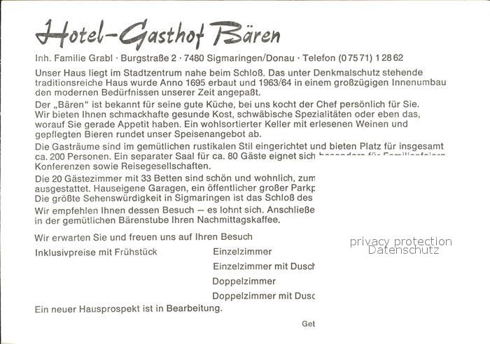 72288386 Sigmaringen Hotel Gasthof Baeren postalisch nicht gelaufen Werbekarte (keine Postkarte) Erhaltung siehe scans KatCode: 11110008437104