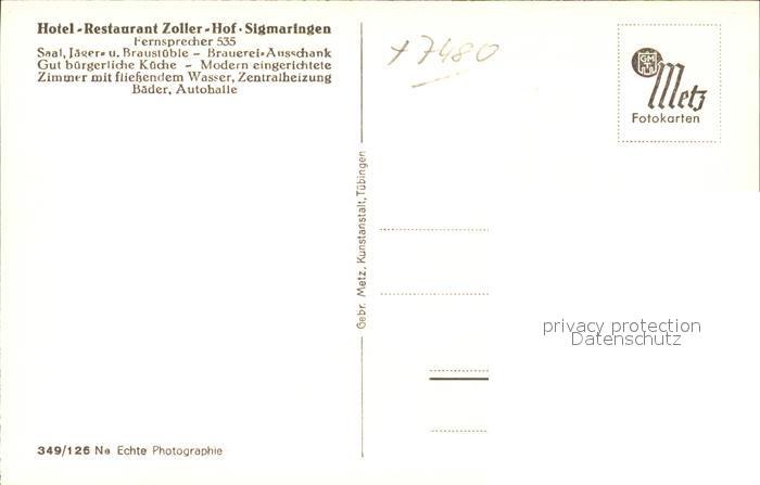 41767849 Sigmaringen Hotel Restaurant Zoller-Hof postalisch nicht gelaufen Erhaltung siehe scans KatCode: 11110008437104