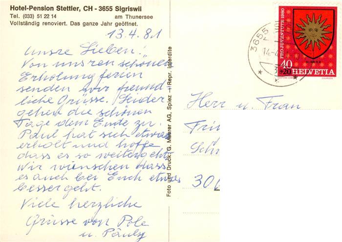 13942340 alte Postkarte Sigriswil BE Hotel Pension Stettler am Thunersee Alpenpanorama postalisch gelaufen Erhaltung siehe scans [FriedD77] KatCode: 11470060240788