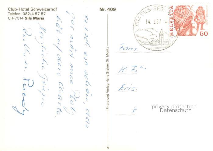 13865734 alte Postkarte Sils Maria GR Club Hotel Schweizerhof Winterlandschaft Alpen postalisch gelaufen Erhaltung siehe scans [FriedD77] KatCode: 11470100335230