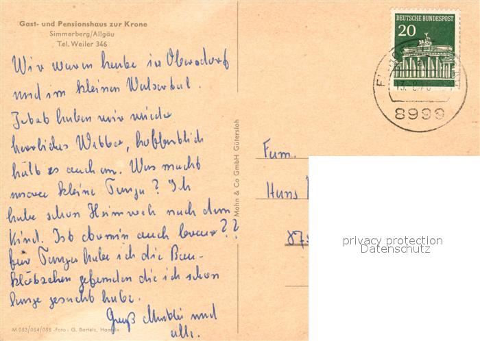 73323641 alte Postkarte Simmerberg Gasthaus Pension zur Krone Landschaftspanorama postalisch gelaufen Erhaltung siehe scans [FriedD77] KatCode: 11110009776129